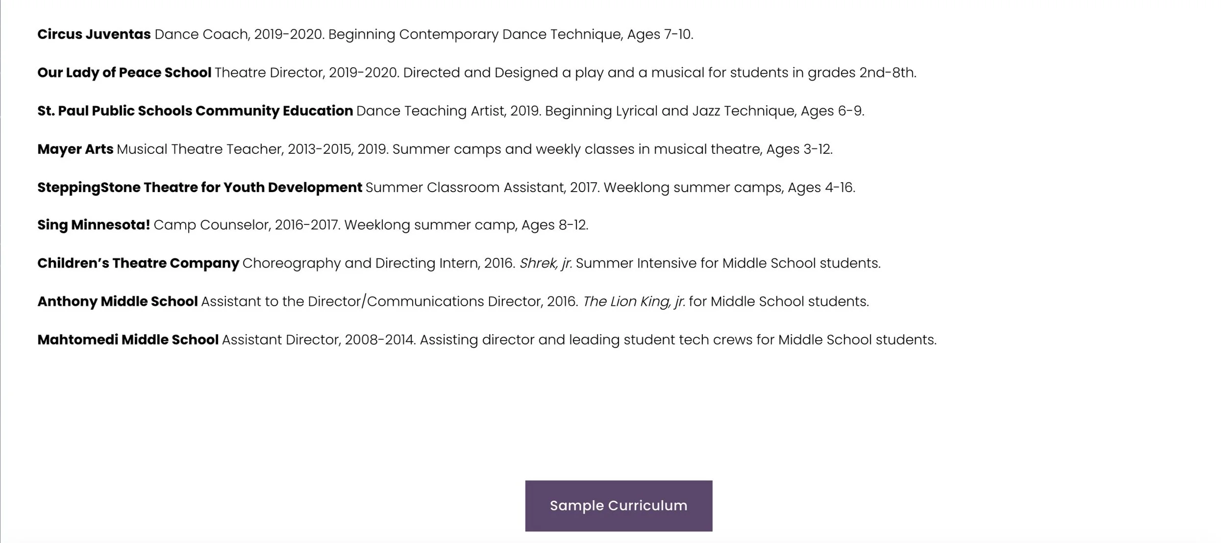 The strongest parts of the page are: a printable teaching resume and a sample dance class curriculum.