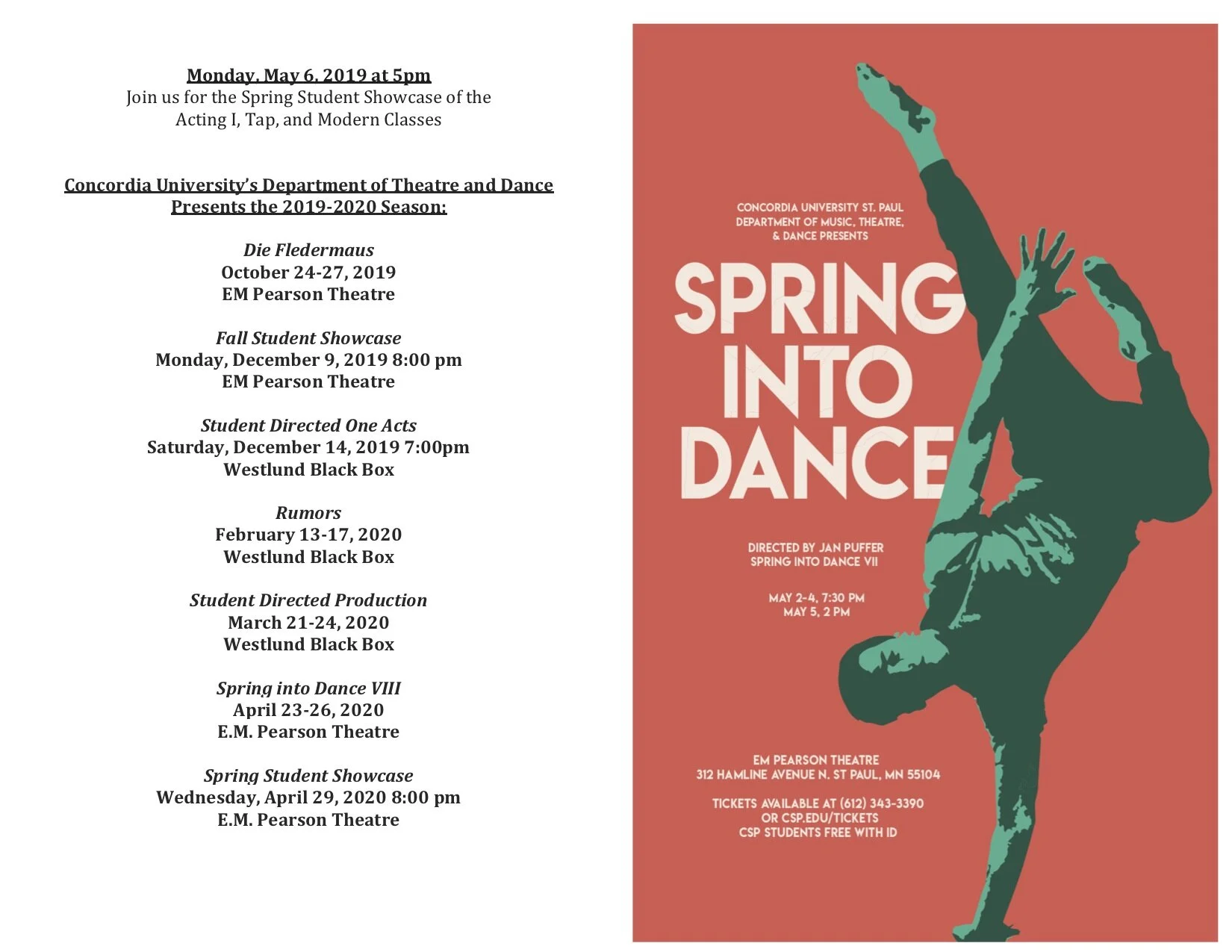 2019-2020 Season: Die Fledermaus, Student Directed One Acts, Rumors, Silent Sky, Spring Into Dance VIII